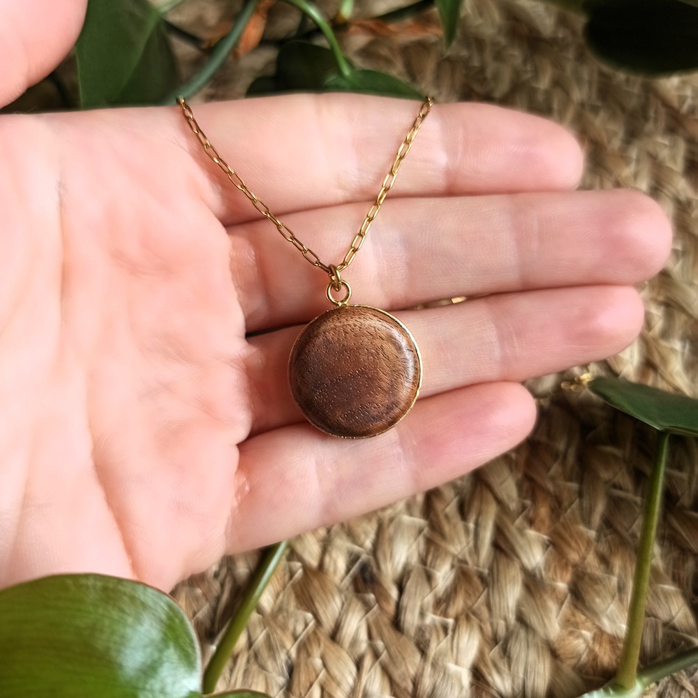 Le bois de noyer utilisé provient de chutes revalorisées issues d’artisans et d’ébénisteries. En lui offrant une seconde vie, je crée des bijoux uniques tout en limitant mon impact sur l’environnement. Choisir ce collier, c’est choisir un bijou artisanal, durable et respectueux de la nature.