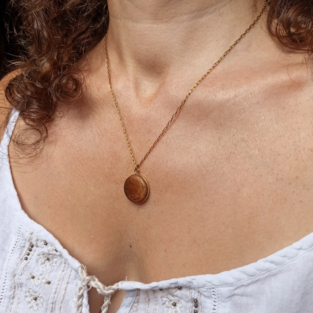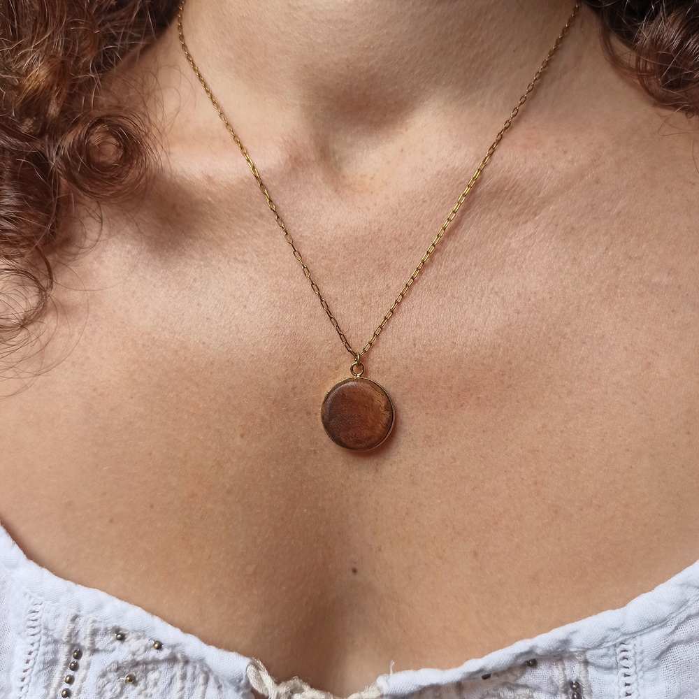 Inspiré par la nature, ce collier met en valeur la beauté brute du bois de noyer, avec ses nuances chaleureuses et ses veinages délicates. Le pendentif rond symbolise l’harmonie, l’équilibre et la douceur intérieure.