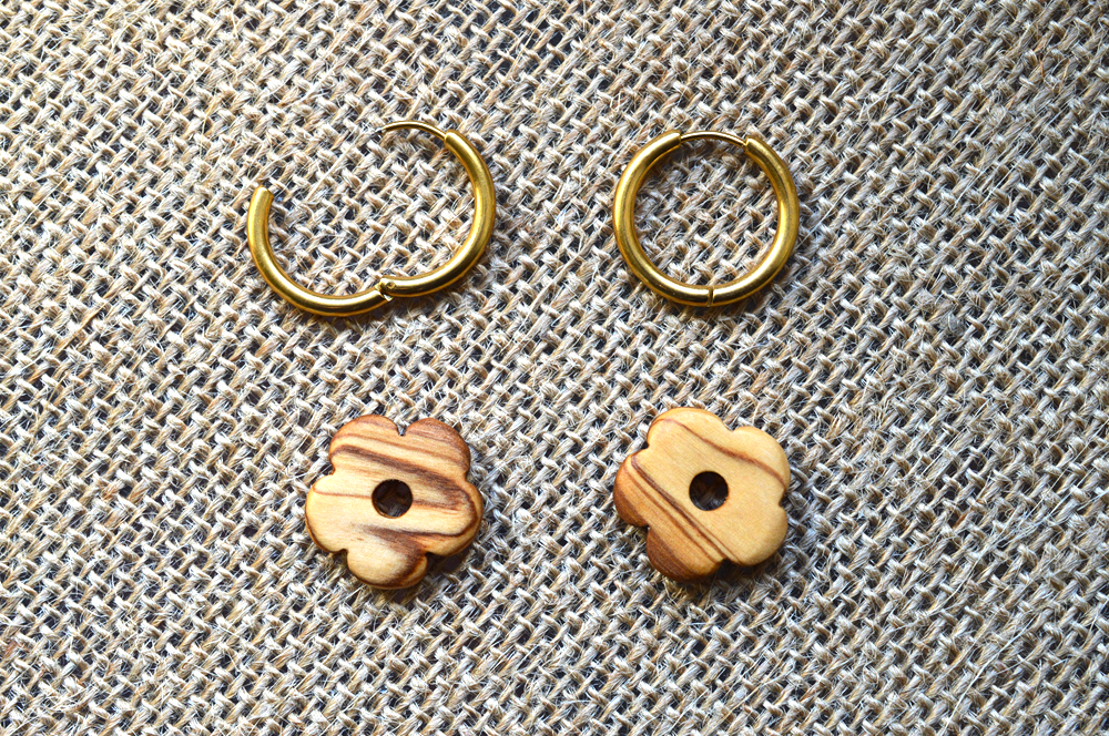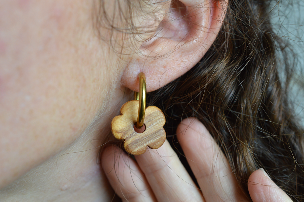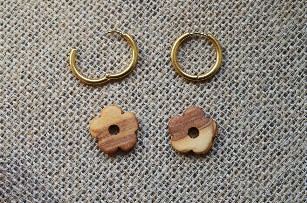 Note : Cette paire de boucles d’oreilles est fabriquée à la main. Avec leur caractère artisanal, ces fleurs en bois sont uniques et peuvent présenter de légères variations de forme ou de teinte, rendant chaque paire de boucles d’oreilles authentique et singulière.