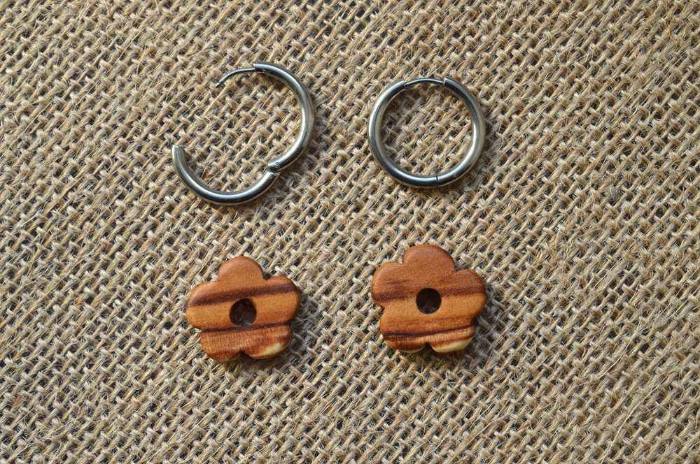 Note : Cette paire de boucles d’oreilles est fabriquée à la main. Avec leur caractère artisanal, ces fleurs en bois sont uniques et peuvent présenter de légères variations de forme ou de teinte, rendant chaque paire de boucles d’oreilles authentique et singulière.