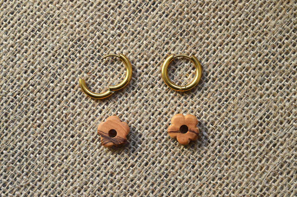 Note : Cette paire de boucles d’oreilles est fabriquée à la main. Avec leur caractère artisanal, ces fleurs en bois sont uniques et peuvent présenter de légères variations de forme ou de teinte, rendant chaque paire de boucles d’oreilles authentique et singulière.